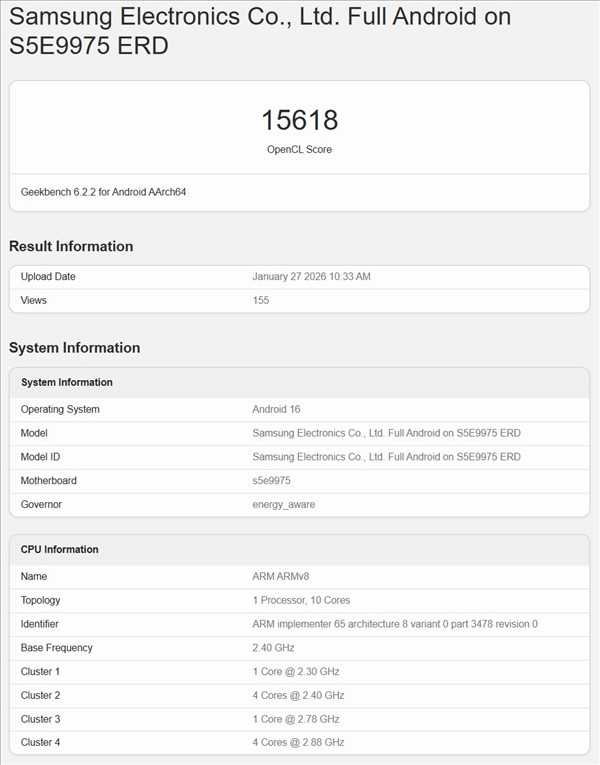 不过此次曝光的跑分数据略显意外,其OpenCL跑分仅为15618分,远低于Exynos 2600。对此官方给出解释,该测试设备为工程研发样机,主要用于调度程序与架构验证工作,其跑分结果并不能代表芯片的最终实际性能。